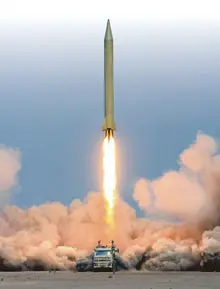 | Испытания ракеты дальнего радиуса действия «Шахаб-3» во время военных маневров в Иране в 2006 году. Вверху: президент Ирана Махмуд Амадинежад грозит стереть Израиль с лица земли |