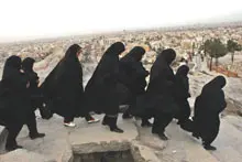 | Мусульманские женщины возвращаются после посещения захоронений неизвестных солдат в Машхаде к северо-востоку от Тегерана |