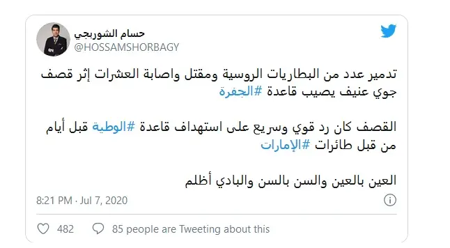 Ранее в ЛНА взяли ответственность за авиаудары по Аль-Ватыи на себя, но эта информация не подтвердилась. Есть несколько версий по поводу виновников произошедшего.