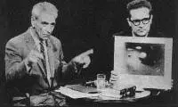 Джордж Адамский (слева) демонстрирует фотографии НЛО и рассказывает о своих якобы состоявшихся встречах с жителями Венеры |