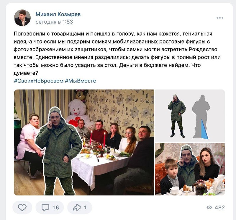 Примечательно, что сегодня в неприятную ситуацию также попал другой парламентарий - депутат Вологодской гордумы Михаил Козырев. СМИ пишут, что народный избранник якобы разместил на своей странице пост со следующими словами: «Поговорили с товарищами и пришла в голову, как нам кажется, гениальная идея, а что, если мы подарим семьям мобилизованных ростовые фигуры с фотоизображениями их защитников, чтобы семьи могли встретить Рождество вместе. Единственное мнения разделились: делать фигуры в полный рост или так, чтобы можно было усадить за стол. Деньги в бюджете найдем. Что думаете?».