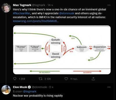 "Я думаю, что теперь существует один шанс из шести неминуемой глобальной ядерной войны, и вот почему я ценю Илона Маска и других, призывающих к деэскалации, что, ИМХО, отвечает интересам национальной безопасности всех стран", - отметил Тегмарк.