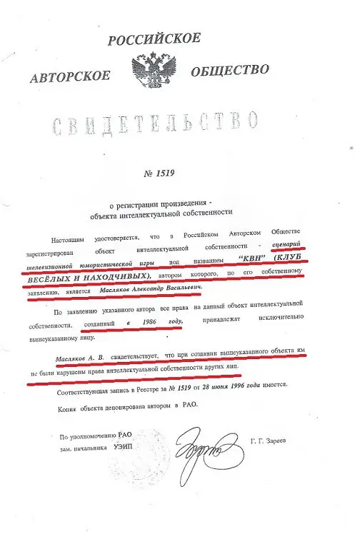 КВН действительно создан в 1961 году, и по информации из открытых источников Александр Масляков просто не мог иметь к его созданию отношения, поскольку пришел туда через три года. На мой взгляд, в РАО не могли этого не заметить – и все же зарегистрировали авторские права. Так как срок исковой давности по этому делу прошел, российское государство, правопреемник советского – как представляется настоящего создателя КВН, оспаривать авторство Маслякова не стало.