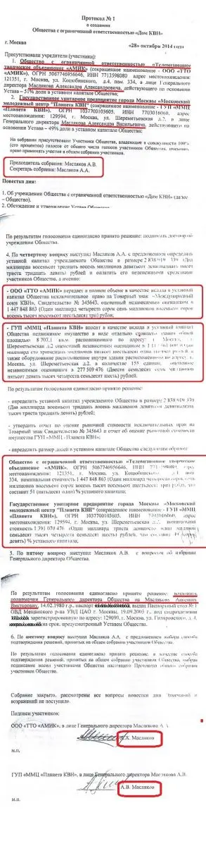 Встречаются два одиночества – генеральный директор ГУП «ММЦ «Планета КВН» Александр Васильевич Масляков и генеральный директор ООО «ТТО АМИК» Александр Александрович Масляков. И решают объединить усилия, чтобы создать что-нибудь новое – например, ООО «Дом КВН», которое объединит активы двух предприятий для более эффективного управления ими. Со стороны государства в лице А. Маслякова-ст. в ООО внесены здание экс -«Гаваны», а ныне «Планеты КВН» стоимостью 1 113 561 000 руб. и другие активы общей стоимостью 277 509 476 руб. А со стороны АМИК – товарный знак «Международный союз КВН» (свидетельство № 345643) стоимостью 1 447 848 863 рубля. Все это по оценке неизвестных «независимых экспертов». ООО «ТТО АМИК» получило 51% в новом ООО, а ГУП «ММЦ «Планета КВН», то есть государство, лишь 49%. Таким образом, здание и все его содержимое оказались под контролем частных лиц.