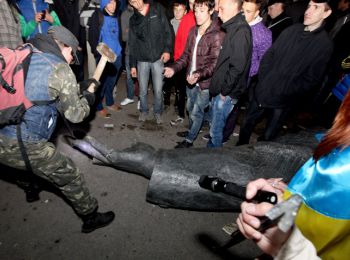 В Харькове, участники митинга за единство Украины в воскресенье сбросили с постамента крупнейший в стране памятник вождю пролетариата. Памятник был разрушен митингующими с помощью тросов и крана.