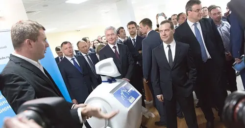 Премьер-министр Дмитрий Медведев, мэр Москвы Сергей Собянин и первый проректор МТИ Евгений Плужник с роботом МТИ