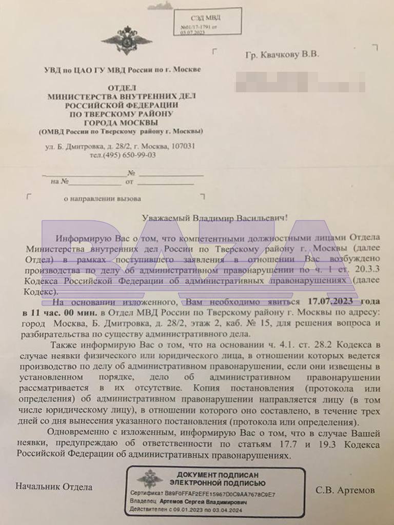 Соответствующую информацию передала супруга мужчины Надежда Квачкова. На 74-летнего военного завели дело по административной статье 20.3.3 КоАП. Однако пока что неизвестно, за что именно полковник может предстать перед судом. Правоохранители вызывали Квачкова в отдел ещё вчера, 17 июля, однако извещение об этом пришло с опозданием, так что теперь он договаривается с блюстителями закона о новой встрече.