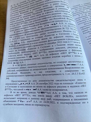 «Доводы Климентовой А. А. о том, что написав на асфальте «Нет в***е», она имела в виду «Нет вобле», поскольку испытывает неприязнь к данному виду рыб, содержащиеся в письменных объяснениях Климентовой А. А. от 24 сентября 2022 года и подтверждённые ею в судебном заседании, никак не опровергнуты», - стало известно из решения.