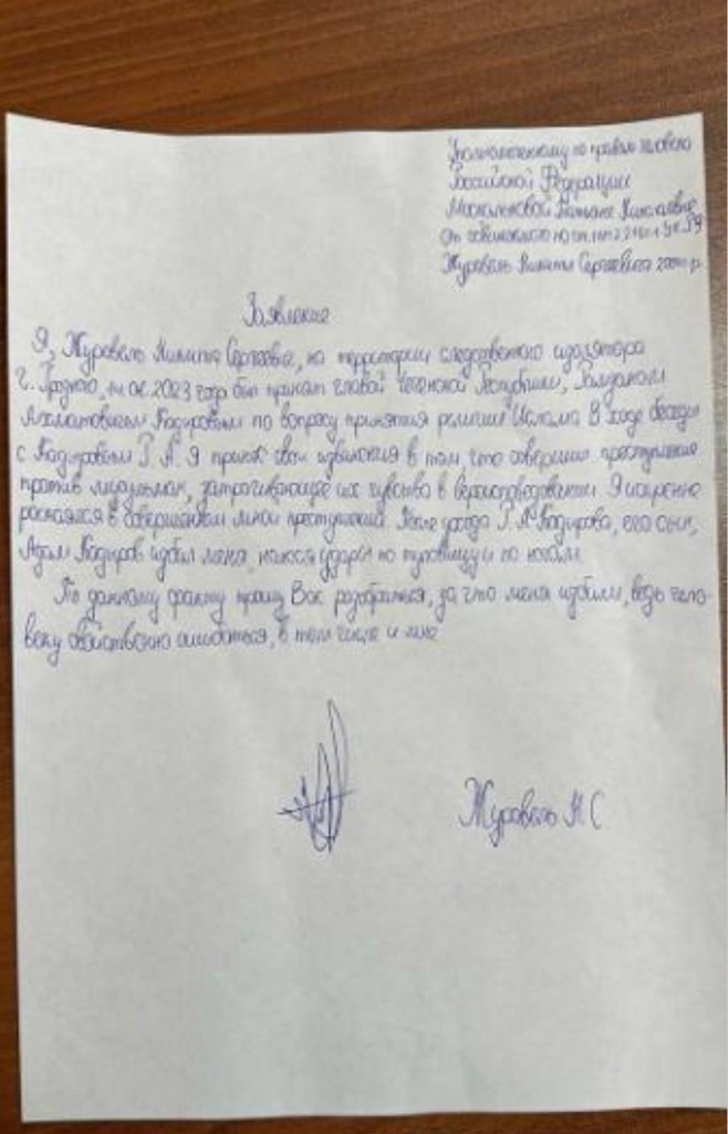 «Грозный-Информ» разместил скриншот обращения волгоградского студента, находящегося в грозненском СИЗО. Журавель пишет, что он встречался с Рамзаном Кадыровым «по вопросу принятия религии ислам». После ухода главы кавказской республики пришел его сын, который якобы и совершил избиение.