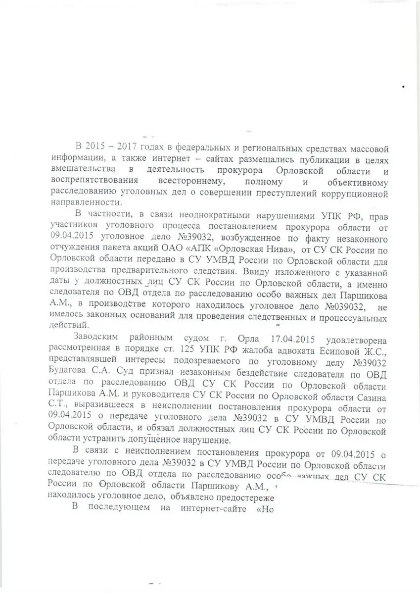 Имеющееся в распоряжении редакции письмо прокуратуры Орловской области в адрес руководства Следственного управления Следственного комитета России по Орловской области, начинается грозно: «В 2015 – 2017 годах в федеральных и региональных средствах массовой информации, а также интернет – сайтах размещались публикации в целях вмешательства в деятельность прокурора Орловской области и воспрепятствования всестороннему, полному и объективному расследованию уголовных дел о совершении преступлений коррупционной направленности». И хотя его подписал и.о. прокурора области Андрей Хамошин, уже из первого абзаца ясно, что его начальник Иван Полуэктов решил «наказать» федеральные и региональные СМИ за «вмешательство в деятельность прокурора Орловской области», то есть его лично.