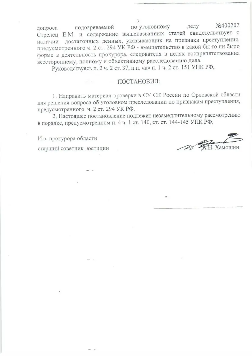 Если уважаемые сотрудники орловской прокуратуры умеют читать, то где, скажите нам, сказано о «действиях работников прокуратуры области, направленных на освобождение Стрелец»? В общем, как с фактической, так и с юридической точки зрения послание орловской прокуратуры в СУ СКР абсолютно беспомощно. Но тем не менее материалы направлены в СУ СКР «для решения вопроса об уголовном преследовании по признакам преступления, предусмотренного ч. 2 ст. 294 УК РФ». А ещё добавлена фраза: «Настоящее постановление подлежит немедленному рассмотрению». В общем, требует прокуратура возбудить уголовное дело против журналистов, причём немедленно.