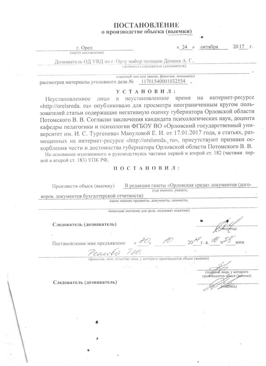 При бывшем губернаторе Орловской области Вадиме Потомском прокуратура регулярно предъявляла претензии региональным СМИ, которые осмелились критиковать деятельность губернатора. Рецидивы этого постыдного процесса можно видеть и сегодня. Например, в редакции газеты «Орловская среда» 24 октября 2017 года был произведён обыск в связи с расследованием уголовного дела № 11701540001032554. В постановлении дознавателя ОД УВД по г. Орлу Дёминой А.Г. говорится: «Неустановленное лицо в неустановленное время на интернет-ресурсе «http://orelsreda.ru» опубликовало для просмотра неограниченным кругом пользователей статьи, содержащие негативную оценку деятельности губернатора Орловской области Потомского В.В. Согласно заключения кандидата психологических наук, доцента кафедры педагогики и психологии ФГБОУ ВО «Орловский государственный университет им. И.С. Тургенева Мантуловой Е.И. от 17.01.2017 года, в статьях, размещённых на интернет-ресурсе «http://orelsreda.ru», присутствуют признаки оскорбления чести и достоинства губернатора Орловской области Потомского В.В.» На основании заключения доцента и провели обыск с изъятием документов бухгалтерской отчётности и договоров.
