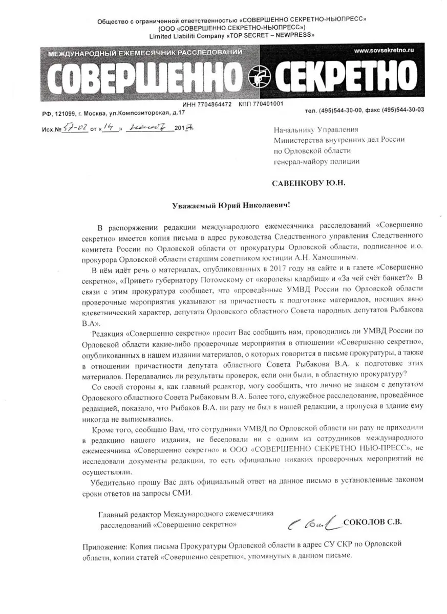 В тот же день временно исполняющий обязанности начальника полиции УМВД России по Орловской области Виталий Власов подписал следующий документ, направленный в адрес главного редактора газеты «Совершенно секретно» Сергея Соколова: «Уважаемый Сергей Викторович! Сообщаю, что в период с мая 2017 по ноябрь 2017 в отношении Международного ежемесячника расследований «Совершенно секретно», по факту опубликованных 11.05.2017 на Интернет–сайте газеты «Совершенно секретно» статьи «Привет» губернатору Потомскому от «королевы кладбищ», 25.08.2017 в газете «Совершенно секретно» статьи «За чей счёт банкет?», а также в отношении причастности к подготовке этих материалов депутата Орловского областного Совета народных депутатов Рыбакова В.А., УМВД России по Орловской области проверочные мероприятия на проводились, результаты в прокуратуру Орловской области не передавались».