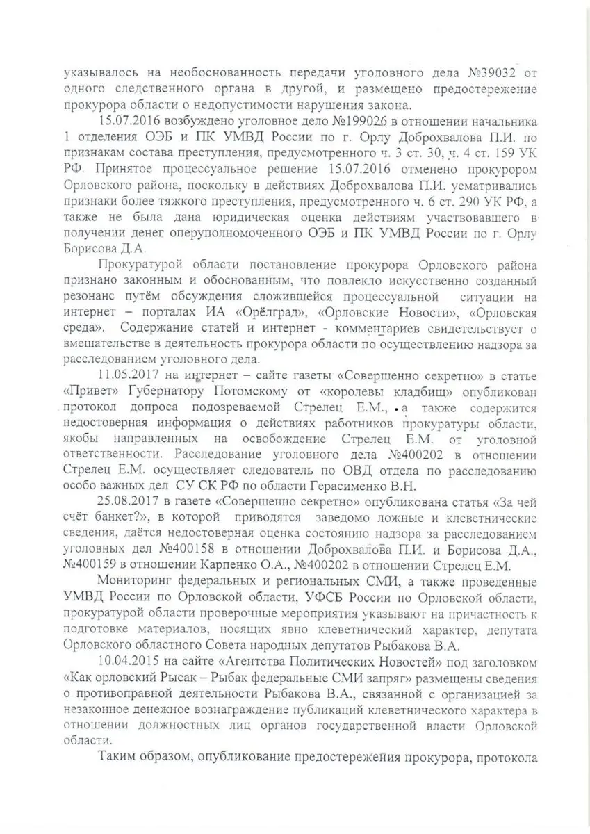 В своё время, когда я смотрел в архиве страшные «расстрельные списки» тридцатых годов, которые некогда были секретными, то обратил внимание на обилие виз на них. Свои подписи под приговорами ставили и Сталин, и Молотов, и Микоян, и Ворошилов, и другие советские руководителями. Этот приём получил название «коллективной ответственности». Орловская прокуратура, видимо, решила вернуться к той практике и возложить ответственность за попытку организовать незаконное и необоснованное уголовное преследование в отношении нашей газеты, и не только её, на другие силовые ведомства. Мы получили прокурорское письмо в своё распоряжение в первой декаде ноября, и в течение двух недель провели определённую исследовательскую работу. Читатели видят, что сразу после упоминания наших «прегрешений», «найденных» в статьях «Привет» губернатору Потомскому от «королевы кладбищ» и «За чей счёт банкет?», опубликованных, соответственно, в мае и сентябре 2017 года и сочтённых «заведомо ложными и клеветническими», в послании орловской прокуратуры в адрес СУ СКР якобы случайно затесался примечательный сюжет. Цитируем документ: «Мониторинг федеральных и региональных СМИ, а также проведённые УМВД России по Орловской области, УФСБ России по Орловской области, прокуратурой области проверочные мероприятия, указывают на причастность к подготовке материалов, явно носящих клеветнический характер, депутата Орловского областного Совета народных депутатов Рыбакова В.А.»