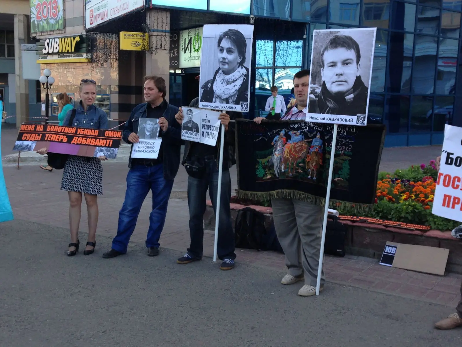 Группа активистов вышла к проезжей части с плакатами, на которых были изображены фотографии тех людей, которым следствие предъявило обвинения по поводу участия в массовых беспорядках и покушения на представителей органов правопорядка 6 мая 2012 года на Болотной площади в Москве. На плакатах с фото было написано - «Свободу!»