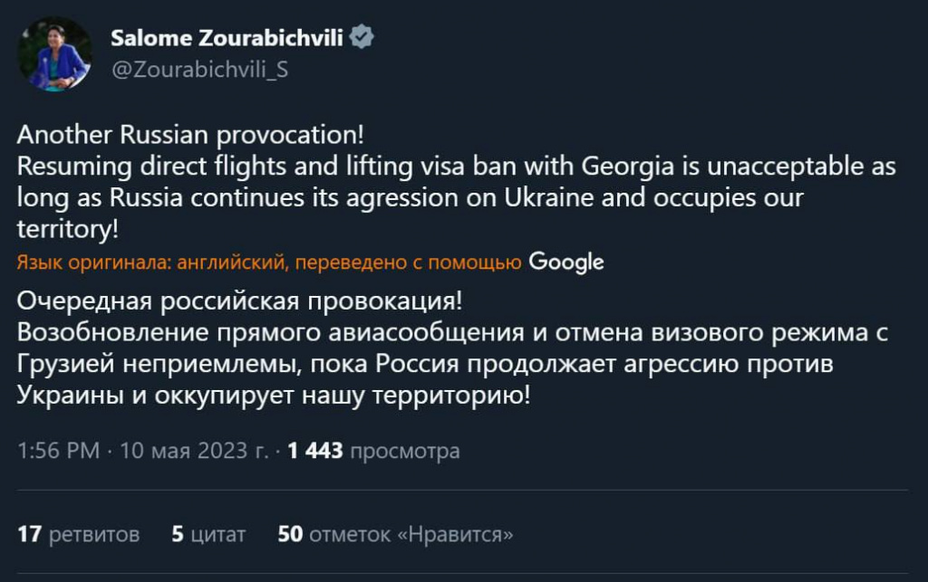 «Очередная российская провокация! Восстановление прямого авиасообщения с Грузией и упразднение визового режима являются неприемлемыми, пока Россия продолжает агрессию на Украине и оккупирует наши территории», - отметила президент Грузии.