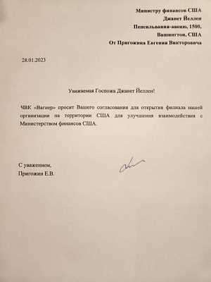 «Уважаемая Госпожа Джанет Йеллен! ЧВК "Вагнер" просит Вашего согласования для открытия филиала нашей организации на территории США», — написал Пригожин.
