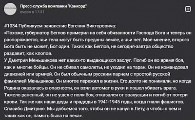 было опубликовано очередное заявление создателя ЧВК «Вагнер» Евгения Пригожина. Оно было посвящено губернатору Санкт-Петербурга Александру Беглову, а также захоронению бойца частной военной компании, которого не хотят предать земле в Питере.