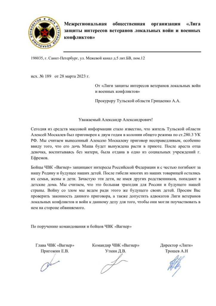 В пресс-службе бизнесмена Евгения Пригожина 28 марта было опубликовано письмо от «Лиги ветеранов локальных конфликтов и войн», в котором прокурора Тульской области Грицаенко А. А. просят перепроверить законность вердикта, вынесенного папе шестиклассницы Марии Москалёвой, 53-летнему Алексею Москалеву. Под обращением стоят подписи создателя ЧВК «Вагнер», командира ЧВК «Вагнер» Уткина Д. В. и директора самой «Лиги» Трошева А. Н.
