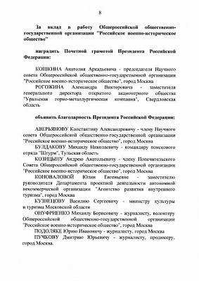 «Объявить благодарность президента РФ ... Онуфриенко Михаилу Борисовичу - журналисту, волонтеру Общероссийской общественно-государственной организации "Российское военно-историческое общество", город Москва; Подоляке Юрию Ивановичу - журналисту, город Москва; Пучкову Дмитрию Юрьевичу - журналисту, продюсеру, город Москва», — стало известно из постановления.