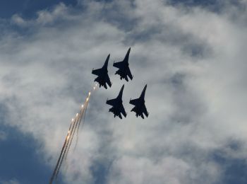 Су-35 — истребитель поколения 4++ большого радиуса действия. Может развивать скорость до 2,5 тыс. км/ч, дальность полета — 3,4 тыс. км, боевой радиус — около 1,6 тыс. км. Вооружен 30-миллиметровой пушкой, имеет 12 точек подвески для навесного вооружения, включая ракеты и бомбы.