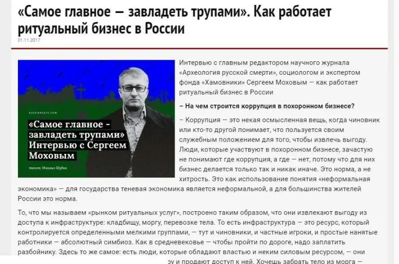 Однако, со временем бизнес-интересы Мохова привели его к теме частных моргов. И в целом, его деятельность перестала удовлетворять заказчиков. Увидев, что Мохов занимается вовсе не тем, за что ему платят, «спонсоры» сделали предупреждение в лучших традициях бандитизма, уверены корреспонденты ФАН.