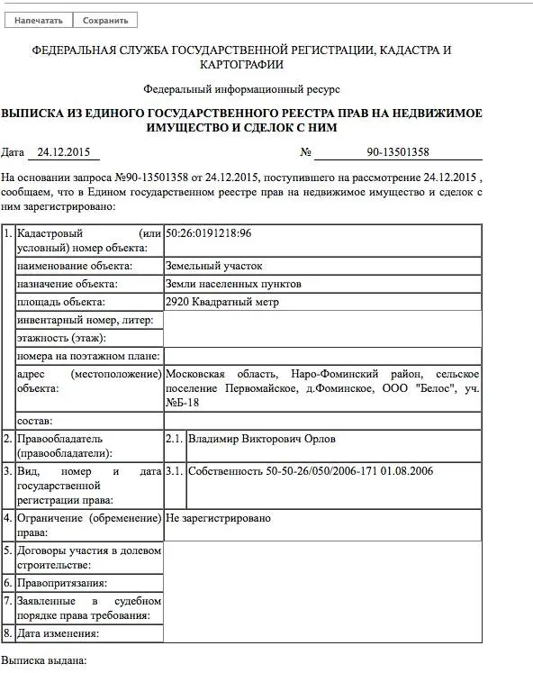 С отсутствием земельного участка у сына, Владимирский губернатор тоже погорячилась. 2920 квадратных метров в Наро-Фоминском районе, в деревне Фоминское, согласно базе данных кадастровой службы, записаны именно на Владимира Викторовича Орлова.