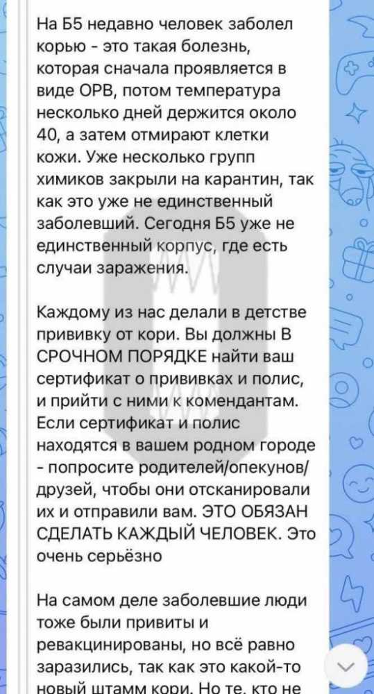 «Студенты на карантине сидят в комнатах без возможности даже просто выйти, такая практика была еще во время ковида. Точного количества заболевших не говорили. Вчера весь день коменданты собирали сертификаты о прививках, а сегодня из общежития не выпускают тех у кого нет прививок», — заявил собеседник «Осторожно, Москва». Также СМИ отмечает, что молодых людей просят не рассказывать о происходящем в интернете.