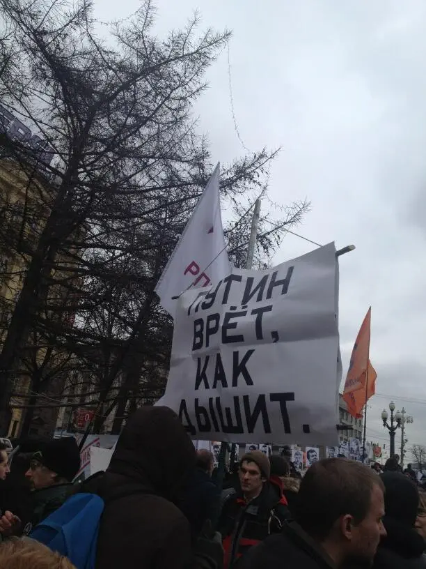 На митинг многие пришли с самодельными плакатами. Время от времени участники акции скандируют: «Свободу обвиняемым по „болотному делу“, „Долой чекистскую власть“. У некоторых значки „Я был на Болотной — арестуйте меня“. Выступали родители задержанных — мама Николая Кавказского читала переписку с сыном.