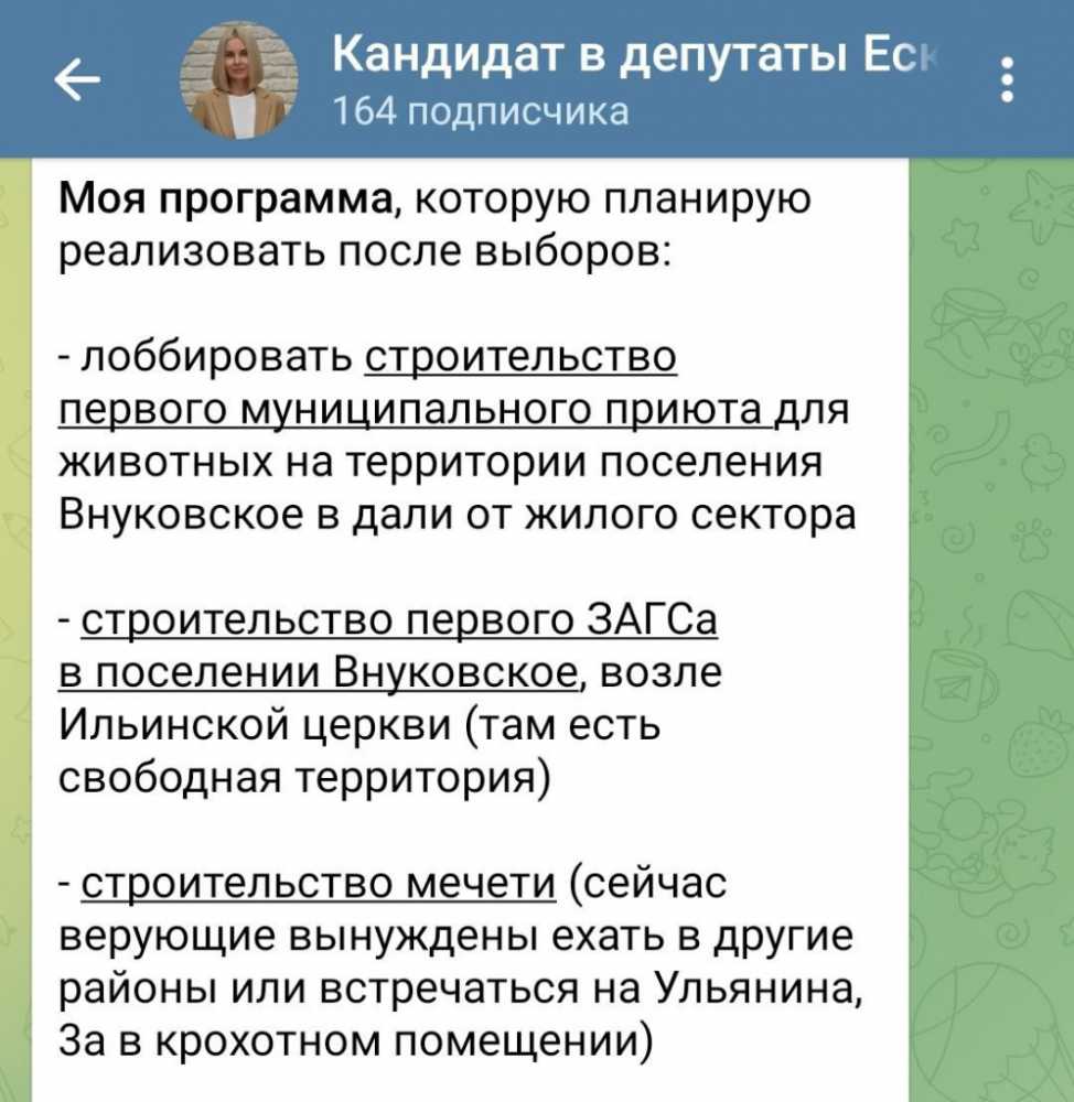 Россиянка опубликовала следующую программу в своём Telegram-канале: лоббировать строительство первого муниципального приюта для животных на территории поселения Внуковское в дали от жилого сектора; построить первый ЗАГС в поселении Внуковское; построить мечети; снизить ставки «Содержание и ремонт» до 31,46₽; поддержать жителей Солнцево Парк в смене УК «ПИК-Комфорт» на другую УК; открыть проезд возле парка «Пыхтино»; открыть все входы и выходы в парк «Пыхтино»; поддержать жителей в установке шлагбаумов во дворах; провести аудит на Град Инвест (котельная ПИК) с целью возврата жителям Солнцево Парк переплаты в 61% за 5 месяцев.