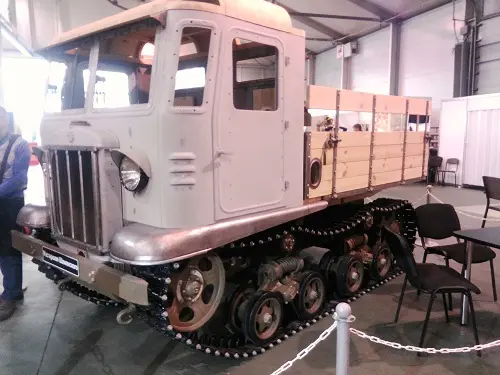 Самым мощным экспонатом выставки по праву считался СТЗ-5 «Сталинец». Артиллерийский гусеничный тягач, выпущенный в 1937 году, был настолько силен, что мощности одного «Сталинца» хватало для одновременной буксировки всех орудий, состоявших на вооружении стрелковой дивизии Красной армии в годы войны. На выставке «Сталинец» демонстрировался в процессе реставрации – из почти десяти тысяч выпущенных тягачей уцелели лишь единицы.