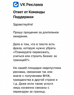 «ВК» запретил рекламировать любые услуги, связанные с переездом за границу