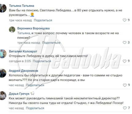 «Учителя, как и врачи, должны повышать свой профессиональный уровень постоянно — как можно руководить школой, не обладая должным культурным уровнем и не стремясь расширять собственный образовательный кругозор?», — пишет петербурженка в группе лицея в Facebook.«Это не гимназия, это позорище. Директор школы — абсолютно некомпетентное создание. Остальные присутствующие на «экстренном совещании» либо такие же личности с отсутствием интеллекта, либо безвольные существа», — отмечает другой пользователь.
