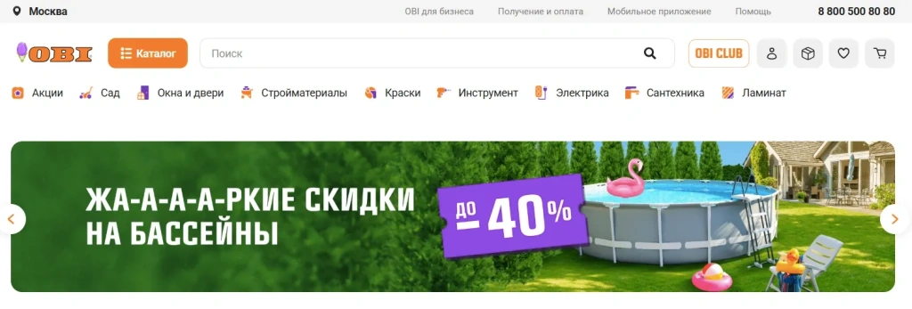 Интернет-магазин OBI полностью дублирует ассортимент гипермаркетов, позволяя делать покупки не выходя из дома. Компания делает большой упор на клиентский сервис. На сайте есть полезные статьи и советы, проводятся мастер-классы, где учат правильно клеить обои или укладывать напольные покрытия. OBI предлагает более 25 сервисных услуг, включая колеровку краски, распил древесины и пошив штор.