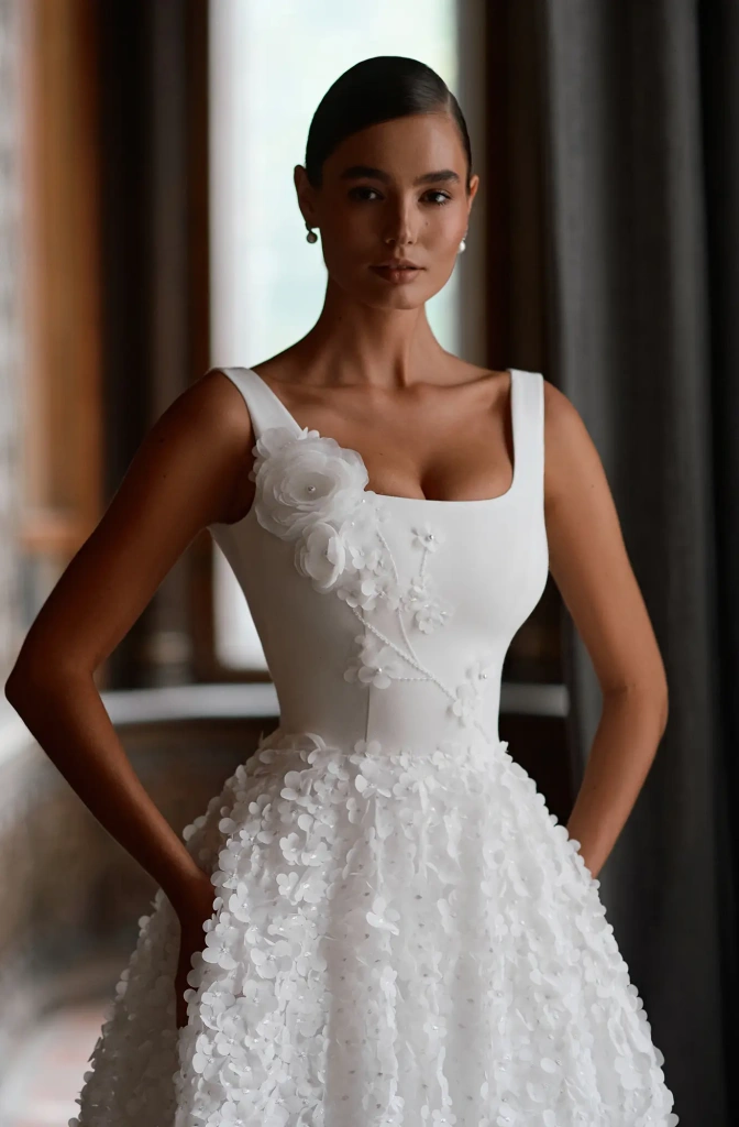 Объемные аппликации, вышивка и 3D-элементы с цветочными узорами стали настоящим хитом коллекций 2025 года. Платья будто оживают благодаря лепесткам, которые украшают корсеты, юбки и рукава, добавляя образу волшебства и свежести.
