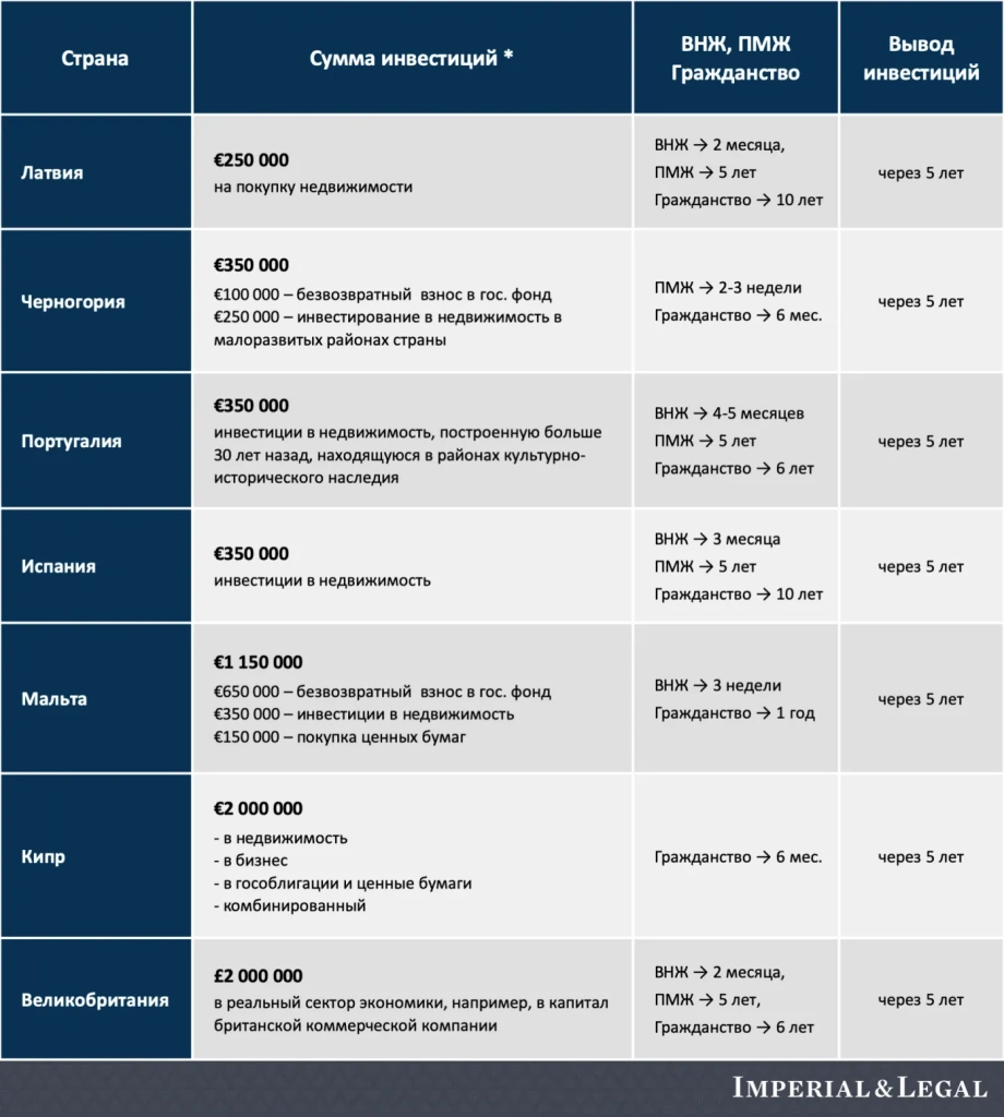 В кратком изложении европейские программы для инвесторов можно представить в виде таблицы: